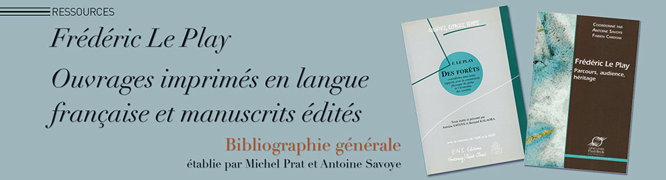 [*] Michel Prat et Antoine Savoye, « Bibliographie des ouvrages imprimées en langue française de Frédéric Le Play », in Antoine Savoye et Fabien Cardoni (coord.), Frédéric Le Play. Parcours, audience, héritage, Paris, Presses des Mines, 2007, p. 291-308.
