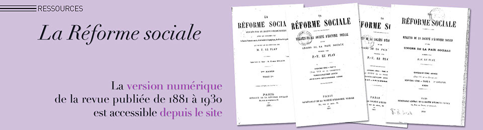 - La Réforme sociale, publiée par un groupe d’économistes, avec le concours de la Société d’économie sociale, de la Société bibliographique, des unions de la paix sociale et sous le patronage de M. F. Le Play (1881), qui devient, après sa mort, La Réforme sociale, organe de l’École de la paix sociale, revue fondée par P.-F. Le Play (1882).